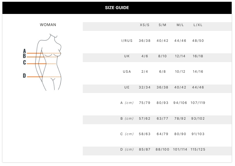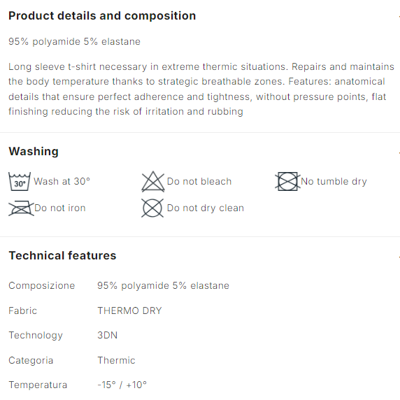Description : Long sleeve t-shirt necessary in extreme thermic situations. Repairs and maintains the body temperature thanks to strategic breathable zones. Features: anatomical details that ensure perfect adherence and tightness, without pressure points, flat finishing reducing the risk of irritation and rubbing.